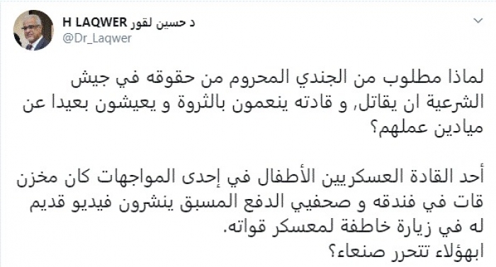 وقال في تغريدة عبر "تويتر" رصدها "المشهد العربي": "لماذا مطلوب من الجندي المحروم من حقوقه في جيش الشرعية أن يقاتل, وقادته ينعمون بالثروة ويعيشون بعيداً عن ميادين عملهم؟".