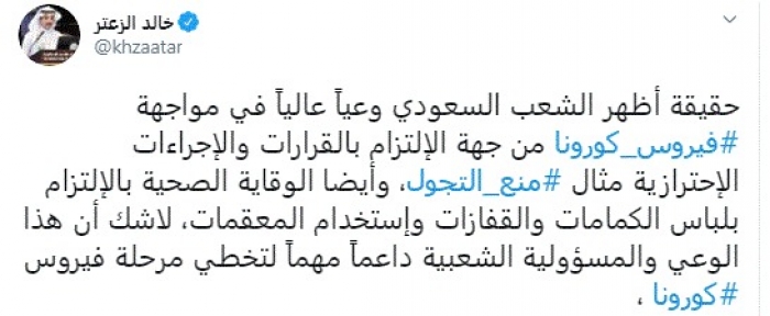 وقال في تغريدة عبر "تويتر" رصدها "المشهد العربي": "حقيقة أظهر الشعب السعودي وعياً عالياً في مواجهة فيروس كورونا من جهة الالتزام بالقرارات والإجراءات الإحترازية مثال منع التجول، وأيضا الوقاية الصحية بالالتزام بلباس الكمامات والقفازات واستخدام المعقمات، لا شك أن هذا الوعي والمسؤولية الشعبية داعماً مهماً لتخطي مرحلة فيروس كورونا".