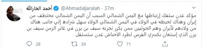 وكتب في تغريدة عبر "تويتر" رصدها "المشهد العربي": "مؤكد عدن ستفك ارتباطها مع اليمن الشمالي السبب أن اليمن الشمالي مختطف من إيران وهناك لخبطة في الولاء في اليمن الشمالي الولاء سهل شراءه إلى جانب هناك من ولاءهم لإيران وهم الحوثيين".