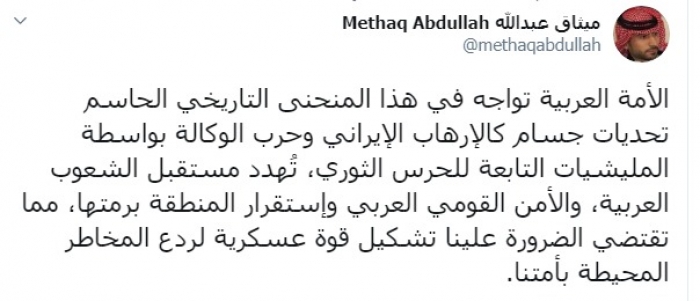 وكتب عبد الله عبر تغربدة له على "توبتر" رصدها " المشهد العربي":"الأمة العربية تواجه في هذا المنحنى التاريخي الحاسم تحديات جسام كالإرهاب الإيراني وحرب الوكالة بواسطة المليشيات التابعة للحرس الثوري".