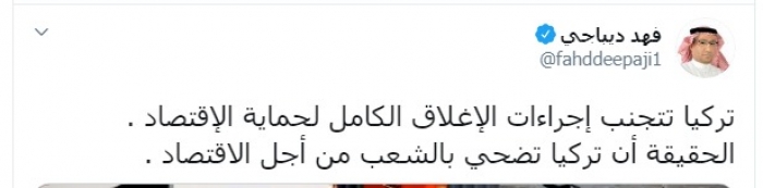 وكتب ديباجي عبر تغريدة له على "تويتر" رصدها " المشهد العربي":"تركيا تتجنب إجراءات الإغلاق الكامل لحماية الاقتصاد، الحقيقة أن تركيا تضحي بالشعب من أجل الاقتصاد" .