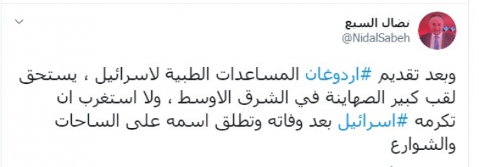 وكتب السبع عبر تغريدة له على "تويتر" رصدها " المشهد العربي":"وبعد تقديم اردوغان المساعدات الطبية لإسرائيل، يستحق لقب كبير الصهاينة في الشرق الأوسط".