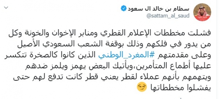 أكد الأمير السعودي البارز سطام بن خالد آل سعود،اليوم الأحد، أن مخططات الإعلام القطري ومنابر الإخوان ضد السعودية فشلت بسبب وعي الشعب السعودي.