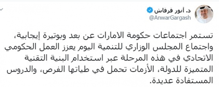 وكتب قرقاش عبر تغريدة له على "تويتر" رصدها " المشهد العربي":"تستمر اجتماعات حكومة الإمارات عن بعد وبوتيرة إيجابية، واجتماع المجلس الوزاري للتنمية اليوم يعزز العمل الحكومي الاتحادي في هذه المرحلة عبر استخدام البنية التقنية المتميزة للدولة".