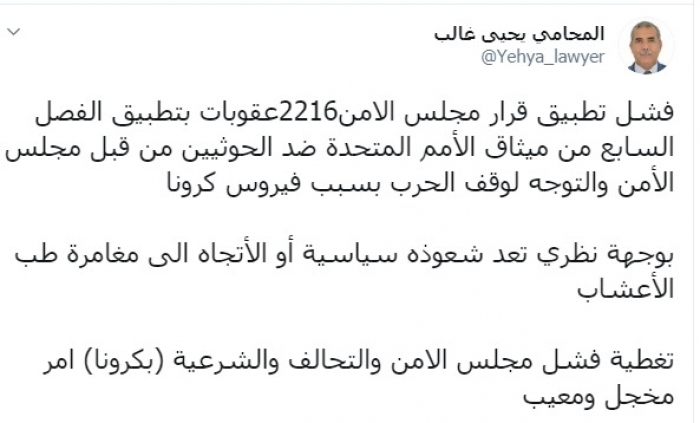 أكد الناشط السياسي، المحامي يحيى غالب، اليوم الأحد، أن فشل تطبيق قرار مجلس الأمن رقم 2216 ضد مليشيا الحوثي والتحجج بكورونا هو أمر مخجل ومعيب.