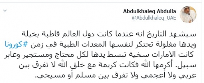 وكتب عبد الله عبر تغريدة له على "تويتر" رصدها " المشهد العربي":"سيشهد التاريخ انه عندما كانت دول العالم قاطبة بخيلة ويدها مغلولة تحتكر لنفسها المعدات الطبية في زمن كورونا كانت الإمارات سخية تبسط يدها لكل محتاج ومستجير وعابر سبيل".