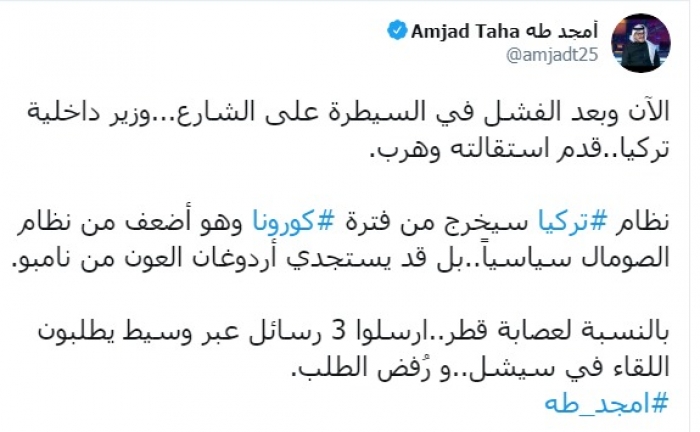 وكتب طه عبر تغريدة له على "تويتر" رصدها " المشهد العربي":"الآن وبعد الفشل في السيطرة على الشارع، وزير داخلية تركيا،قدم استقالته وهرب".
