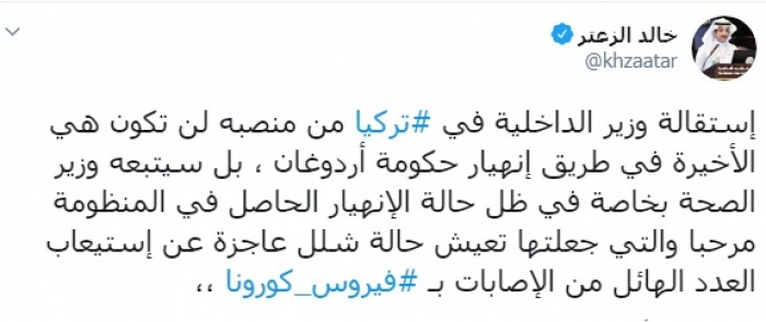 وكتب الزعتر عبر تغريدة له على "تويتر" رصدها "المشهد العربي" :"استقالة وزير الداخلية في تركيا من منصبه لن تكون هي الأخيرة في طريق إنهيار حكومة أردوغان".