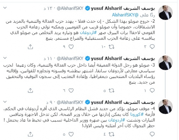 وأضاف:"خروج صويلو بهذا الشكل - إن حدث فعلا - يهدد حزب العدالة والتنمية بالمزيد من الانشقاقات، خصوصا وأن صويلو قريب من القوميين ويمكنه تولي زعامة الحزب القومي لاحقا! برات البيرق صهر اردوغان هو وتياره يريد التخلص من صويلو الذي ينافسه على زعامة الحزب المستقبلية والصراع مستمر".