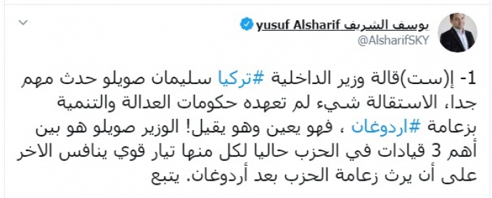 وكتب الشريف عبر تغريدات له على "تويتر" رصدها " المشهد العربي":" استقالة وزير داخلية تركيا سليمان صويلو حدث مهم جدا، الاستقالة شئ لم تعهده حكومات العدالة والتنمية بزعامة أردوغان ، فهو يعين وهو يقيل! الوزير صويلو هو بين أهم 3 قيادات في الحزب حاليا لكل منها تيار قوي ينافس الأخر على أن يرث زعامة الحزب بعد أردوغان".