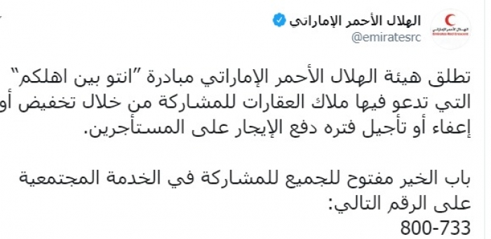 وكتبت الهيئة عبر تغريدة لها على "تويتر" رصدها " المشهد العربي":"تطلق هيئة الهلال الأحمر الإماراتي مبادرة ”انتو بين اهلكم“ التي تدعو فيها ملاك العقارات للمشاركة من خلال تخفيض أو إعفاء أو تأجيل فتره دفع الإيجار على المستأجرين.