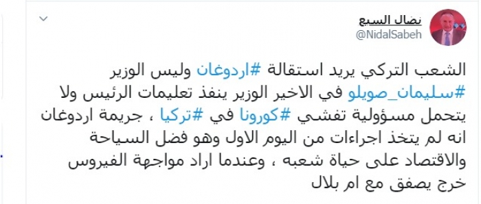 وكتب السبع عبر تغريدة له على "تويتر" رصدها " المشهد العربي":"الشعب التركي يريد استقالة أردوغان وليس الوزير سليمان_صويلو، في الأخير الوزير ينفذ تعليمات الرئيس ولا يتحمل مسؤولية تفشي كورونا في تركيا".