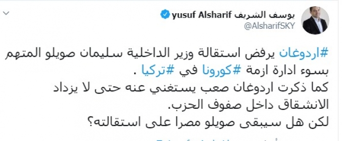 وكتب الشريف عبر تغريدة له على "تويتر" رصدها " المشهد العربي":"اردوغان يرفض استقالة وزير الداخلية سليمان صويلو المتهم بسوء إدارة أزمة كورونا في تركيا".