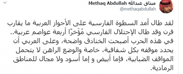 وكتب عبد الله عبر تغريدة له على "تويتر" رصدها " المشهد العربي":"لقد طال أمد السطوة الفارسية على الأحواز العربية ما يقارب قرن وقد طال الاحتلال الفارسي مُؤَخرًا أربعة عواصم عربية".