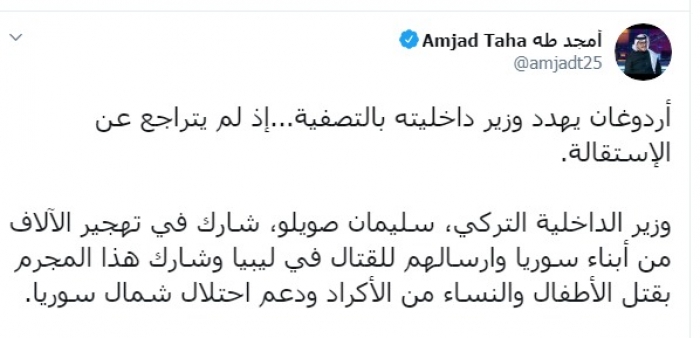 وكتب طه عبر تغريدة له على "تويتر" رصدها " المشهد العربي":"أردوغان يهدد وزير داخليته بالتصفية، إذ لم يتراجع عن الاستقالة".