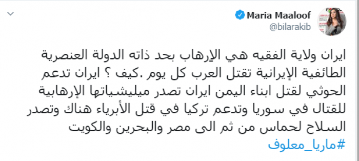 وكتبت عبر تغريدة لها على "تويتر" رصدها " المشهد العربي":"إيران ولاية الفقيه هي الإرهاب بحد ذاته الدولة العنصرية الطائفية الإيرانية تقتل العرب كل يوم ،كيف ؟".