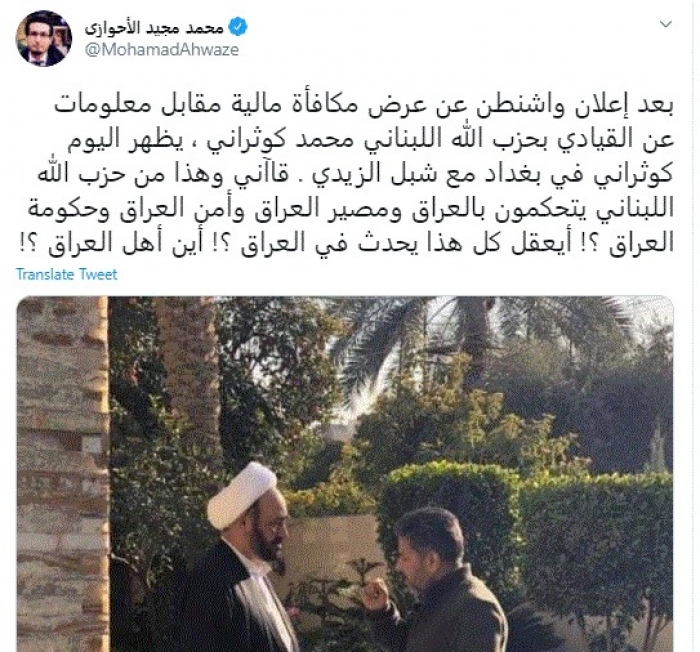 وقال في تغريدة عبر "تويتر" رصدها "المشهد العربي": "بعد إعلان واشنطن عن عرض مكافأة مالية مقابل معلومات عن القيادي بحزب الله اللبناني محمد كوثراني، يظهر اليوم كوثراني في بغداد مع شبل الزيدي".
