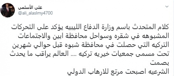 وقال في تغريدة عبر "تويتر" رصدها "المشهد العربي": "كلام المتحدث باسم وزارة الدفاع الليبية يؤكد على التحركات المشبوهة في شقرة وسواحل محافظة أبين والاجتماعات التركية التي حصلت في محافظة شبوة قبل حوالي شهرين تحت مسمى جمعيات خيرية تركية".