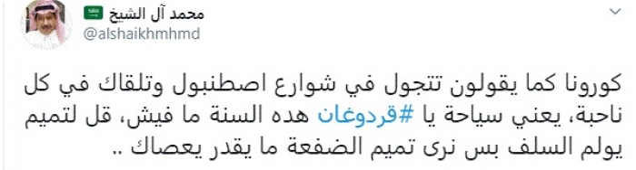 وكتب في تغريدة عبر "تويتر" رصدها "المشهد العربي": "كورونا كما يقولون تتجول في شوارع إسطنبول وتلقاك في كل ناحبة، يعني سياحة يا أردوغان هده السنة ما فيش، قل لتميم يولم السلف بس نرى تميم الضفعة ما يقدر يعصاك".