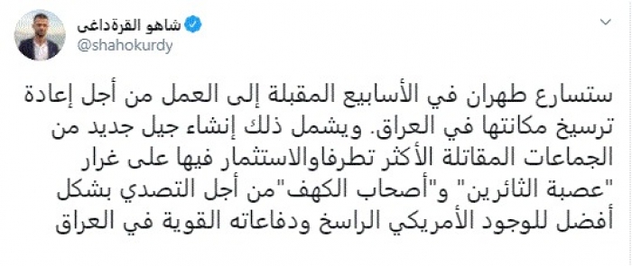 وقال في تغريدة عبر "تويتر" رصدها "المشهد العربي": "ستسارع طهران في الأسابيع المقبلة إلى العمل من أجل إعادة ترسيخ مكانتها في العراق. ويشمل ذلك إنشاء جيل جديد من الجماعات المقاتلة الأكثر تطرفاً والاستثمار فيها على غرار عصبة الثائرين وأصحاب الكهف من أجل التصدي بشكل أفضل للوجود الأمريكي الراسخ ودفاعاته القوية في العراق".