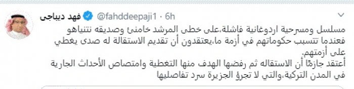 وأضاف: "اعتقد جازمًا أن الاستقاله ثم رفضها الهدف منها التغطية وامتصاص الأحداث الجارية في المدن التركية، والتي لا تجرؤ الجزيرة سرد تفاصليها".