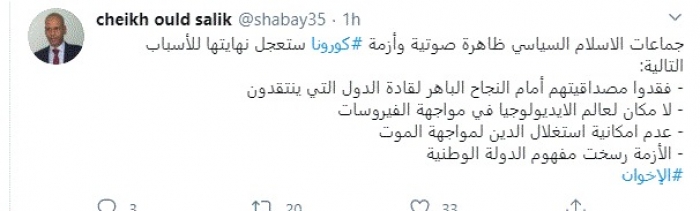 قال الكاتب الصحفي الموريتاني الشيخ بن سالك، اليوم، إن جماعات الإسلام السياسي ظاهرة صوتية، مشيرًا إلى أن أزمة فيروس كورونا ستعجل نهاية الإخوان وتلك الجماعات.