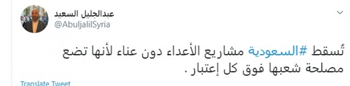 وقال في تغريدة عبر "تويتر" رصدها "المشهد العربي": "تُسقط السعودية مشاريع الأعداء دون عناء لأنها تضع مصلحة شعبها فوق كل اعتبار".