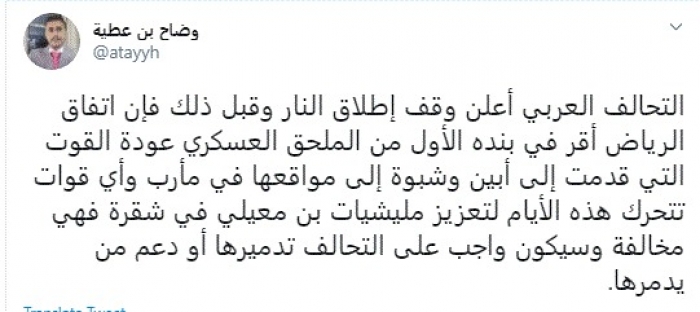 وكتب في تغريدة عبر "تويتر" رصدها "المشهد العربي": "التحالف العربي أعلن وقف إطلاق النار وقبل ذلك فإن اتفاق الرياض أقر في بنده الأول من الملحق العسكري عودة القوات التي قدمت إلى أبين وشبوة إلى مواقعها في مأرب وأي قوات تتحرك هذه الأيام لتعزيز مليشيات بن معيلي في شقرة فهي مخالفة وسيكون واجب على التحالف تدميرها أو دعم من يدمرها".