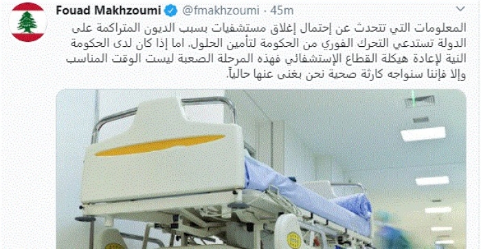 وقال في تغريدة عبر "تويتر" رصدها "المشهد العربي": "المعلومات التي تتحدث عن احتمال إغلاق مستشفيات بسبب الديون المتراكمة على الدولة تستدعي التحرك الفوري من الحكومة لتأمين الحلول".