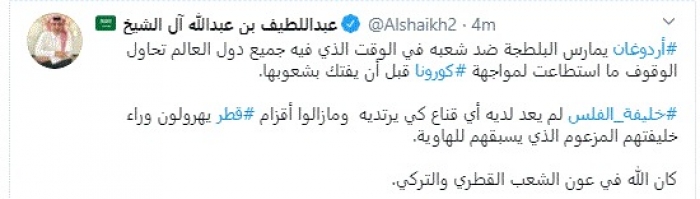 هاجم الكاتب السعودي عبداللطيف آل الشيخ، اليوم، الرئيس التركي رجب طيب أردوغان وأمير قطر تميم بن حمد آل ثاني، وذلك جراء تعاملهم مع أزمة فيروس كورونا.