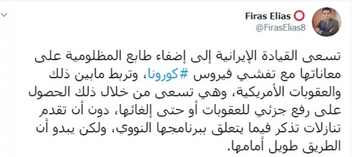 وكتب إلياس عبر تغريدة له على "تويتر" رصدها "المشهد العربي":"تسعى القيادة الإيرانية إلى إضفاء طابع المظلومية على معاناتها مع تفشي فيروس كورونا، وتربط مابين ذلك والعقوبات الأمريكية".