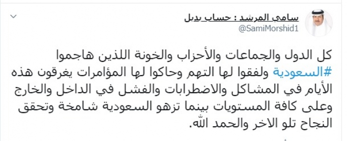 وكتب المرشد عبر تغريدة له على "تويتر" رصدها " المشهد العربي":" كل الدول والجماعات والأحزاب والخونة الذين هاجموا السعودية ولفقوا لها التهم وحاكوا لها المؤامرات يغرقون هذه الأيام في المشاكل والاضطرابات والفشل في الداخل والخارج وعلى كافة المستويات".