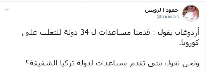وكتب الرويس عبر تغريدة له على "تويتر" رصدها " المشهد العربي":"أردوغان يقول : قدمنا مساعدات لـ 34 دولة للتغلب على كورونا،ونحن نقول متى تقدم مساعدات لدولة تركيا الشقيقة؟"
