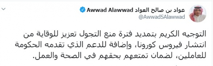 وكتب العواد عبر تغريدة له على " تويتر" رصدها " المشهد العربي":"التوجيه الكريم بتمديد فترة منع التجول تعزيز للوقاية من انتشار فيروس كورونا، وإضافة للدعم الذي تقدمه الحكومة للعاملين، لضمان تمتعهم بحقهم في الصحة والعمل"
