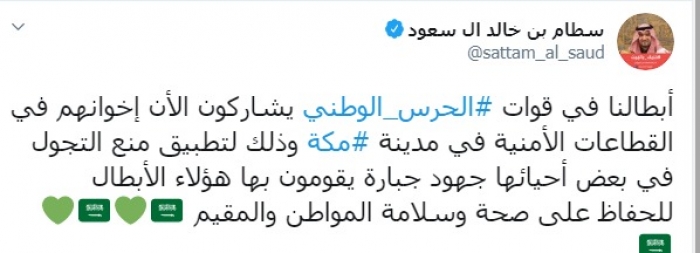 وكتب آل سعود عبر تغريدة له على "تويتر" رصدها " المشهد العربي":"أبطالنا في قوات الحرس الوطني يشاركون الآن إخوانهم في القطاعات الأمنية في مدينة مكة وذلك لتطبيق منع التجول في بعض أحيائها".