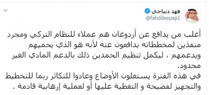وكتب ديباجي عبر تغريدة له على "تويتر" رصدها " المشهد العربي":"أغلب من يدافع عن أردوغان هم عملاء للنظام التركي ومجرد منفذين لمخططاته يدافعون عنه لأنه هو الذي يحميهم ويدعمهم ، ليكمل تنظيم الحمدين ذلك بالدعم المادي الغير محدود".