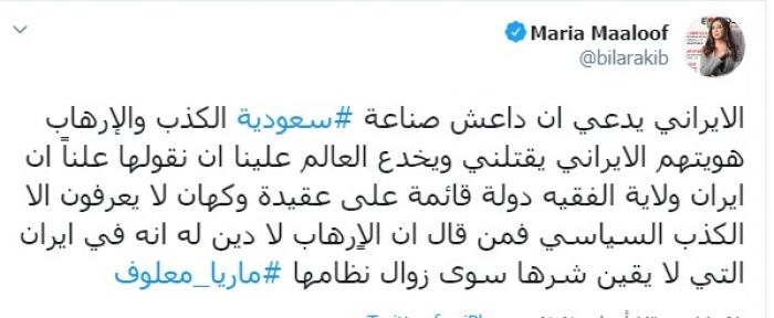 وكتبت معلوف عبر تغريدة لها على "تويتر" رصدها " المشهد العربي":"الإيراني يدعي إن داعش صناعة سعودية، الكذب والإرهاب هويتهم، الإيراني يقتلني ويخدع العالم".