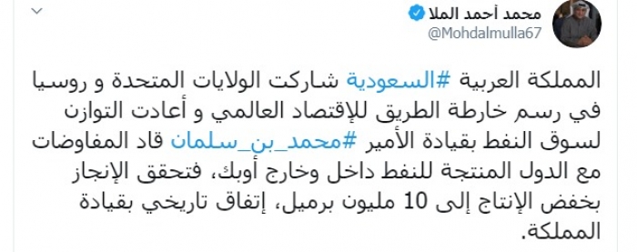 وكتب الملا عبر تغريدة له على "تويتر" رصدها " المشهد العربي":"المملكة العربية السعودية شاركت الولايات المتحدة و روسيا في رسم خارطة الطريق للاقتصاد العالمي".