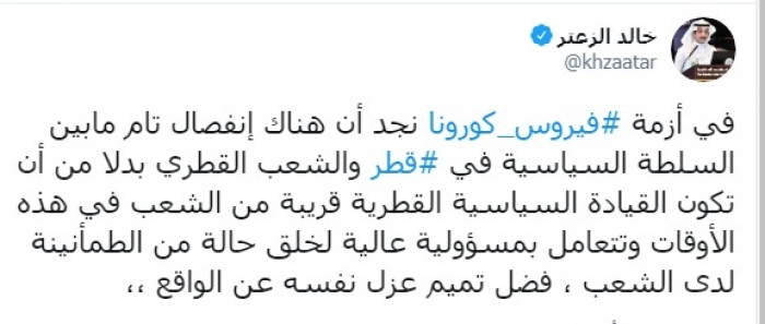 وكتب الزعتر عبر تغريدة له على "تويتر" رصدها " المشهد العربي":"في أزمة فيروس كورونا نجد أن هناك انفصال تام مابين السلطة السياسية في قطر والشعب القطري".