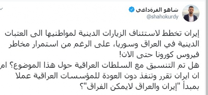 وكتب عبر تغريدة له على "تويتر" رصدها " المشهد العربي":"إيران تخطط لاستئناف الزيارات الدينية لمواطنيها إلى العتبات الدينية في العراق وسوريا، على الرغم من استمرار مخاطر فيروس كورونا حتى الآن".
