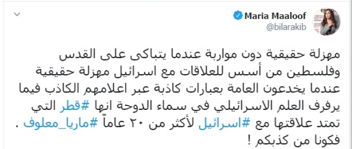 وكتبت معلوف عبر تغريدة لها على "تويتر" رصدها " المشهد العربي":"مهزلة حقيقية دون مواربة عندما يتباكى على القدس وفلسطين من أسس للعلاقات مع إسرائيل مهزلة حقيقية عندما يخدعون العامة بعبارات كاذبة عبر إعلامهم الكاذب فيما يرفرف العلم الإسرائيلي في سماء الدوحة".