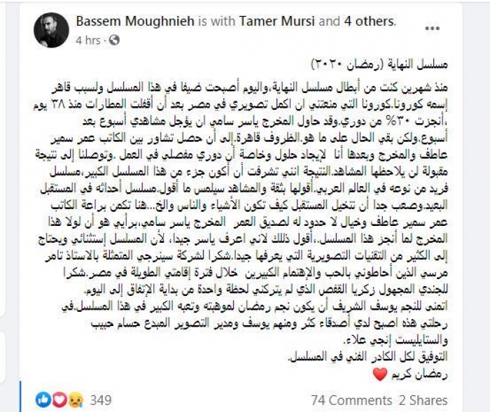 وكتب مغنية: "مسلسل النهاية (رمضان ٢٠٢٠، منذ شهرين كنت من أبطال مسلسل النهاية، واليوم أصبحت ضيفًا في هذا المسلسل ولسبب قاهر اسمه كورونا، التي منعتني أن أكمل تصويري في مصر بعد أن أقفلت المطارات منذ ٣٨ يوم".