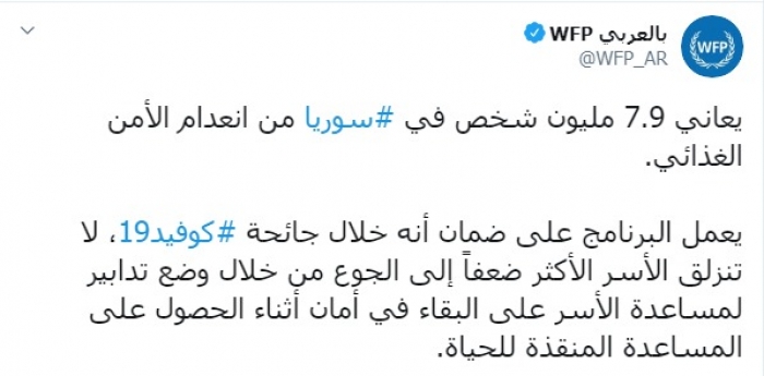 وكتب البرنامج عبر تغريدة له على "تويتر" رصدها " المشهد العربي":"يعاني 7.9 مليون شخص في سوريا من انعدام الأمن الغذائي".