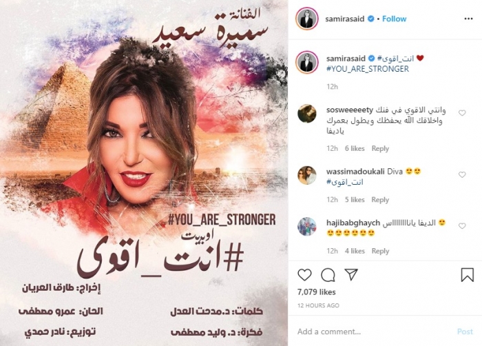 وشاركت "سميرة"، جمهورها عبر "إنستجرام"، بوستر الأغنية ظهرت صورتها عليه منفردة وعلقت قائلة: "أنت أقوى".