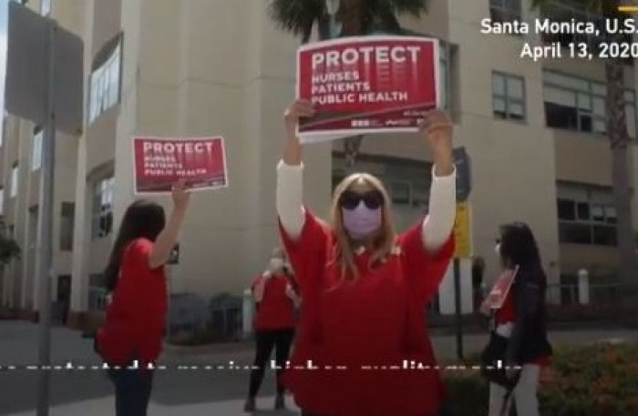 وعرضت قناة ABC News الأمريكية فيديو للممرضات وهن يقفن أمام أبواب مستشفى سانتا مونيكا في ولاية كاليفورنيا، ويحملن اللفتات التي تطالب بتوفير المعدات الوقائية أمام كاميرات وسائل الاعلام العالمية.