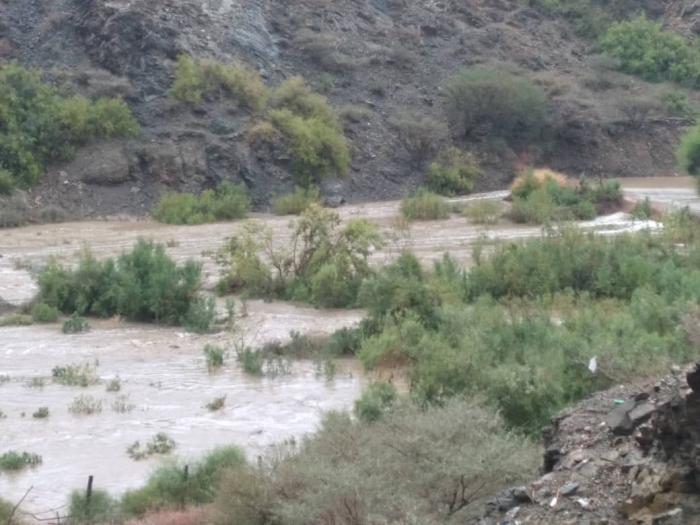 ولا تزال الأمطار تهطل على رؤوس الجبال وعلو الوديان، ومن المتوقع أن ترتفع السيول وتتدفق بكثرة وسرعة كبيرة.