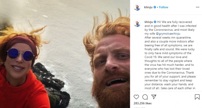 شارك الممثل النرويجي كريستوفر هيفجو، بطل مسلسل Game of Thrones، جمهوره ومتابيعه على مستوى العالم، صورة له برفقة زوجته، أعلن خلالها عن تعافيه من فيروس كورونا، بعد إصابتهما وقضائهما أسابيع في الحجر الصحي.