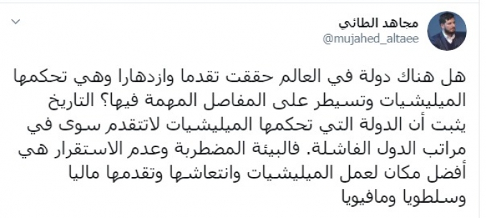 وأضاف:" التاريخ يثبت أن الدولة التي تحكمها الميليشيات لا تتقدم سوى في مراتب الدول الفاشلة. فالبيئة المضطربة وعدم الاستقرار هي أفضل مكان لعمل الميليشيات وانتعاشها وتقدمها ماليا وسلطويا ومافيويا".