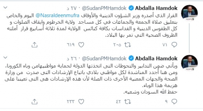 وكتب حمدوك عبر تغريدات له على "تويتر" رصدها " المشهد العربي":"القرار الذي أصدره وزير الشؤون الدينية والأوقاف نصر الدين مفرح اليوم والخاص بتعليق صلاة الجمعة والجماعات في كل مساجد ولاية الخرطوم وإيقاف الصلوات و كل الطقوس الدينية و القداسات بكافة كنائس الولاية لمدة ثلاثة أسابيع قرار أملته الظروف الصحية التي تمر بها البلاد".