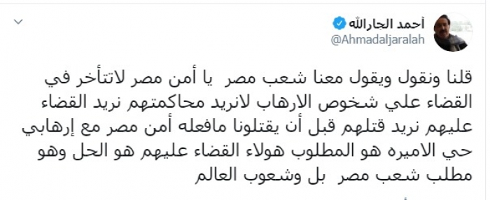 وكتب الجارالله عبر تغريدة له على "تويتر" رصدها" المشهد العربي":"قلنا ونقول ويقول معنا شعب مصر يا أمن مصر لا تتأخر في القضاء علي شخوص الإرهاب لا نريد محاكمتهم نريد القضاء عليهم نريد قتلهم قبل أن يقتلونا ".